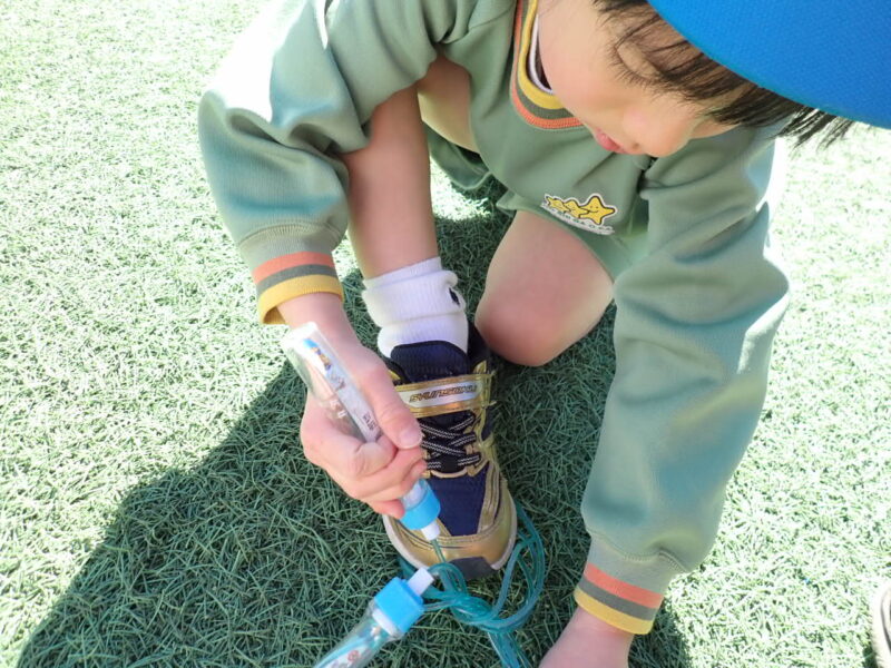 最後に、縄の結び方を、教えて頂きました。1回、2回と半分にしたら、靴に巻いて縛る方法。1回だけ折ったのでは長すぎ( ;∀;)。2回折ると靴の方が大きくて巻けない💦。靴も大きくなったしねぇ~。お友だちと協力して結んでましたよ。
