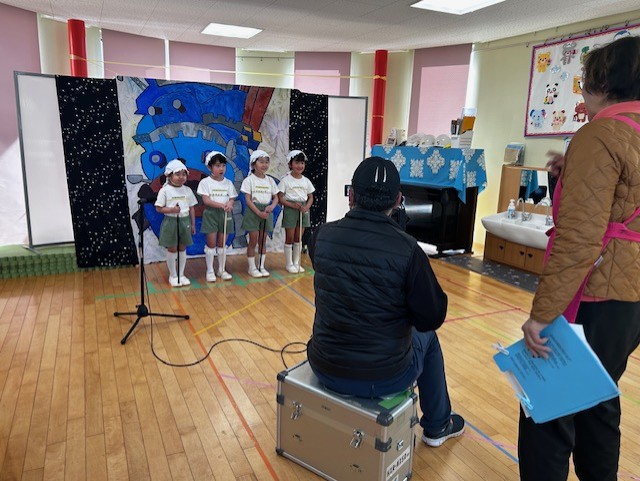 発表会インタビューの日。自分の好きな場面や台詞、動き等を、インタビュー。年中さんの時は、ドキドキして言えなくなってしまったり、「なぜかというと・・・。」と、理由が言えなかったお友だちが、動きながら伝えることが出来たり、カメラ目線もしっかりできたり・・・。担任の無言の「ハイッ。」の合図に落ち着いて答えるのを見て、「成長したなぁ。」と、嬉しくなりながら、撮影をしました。程よい緊張で、終わると「ホッ~。」と、ため息。出来上がりが楽しみです。