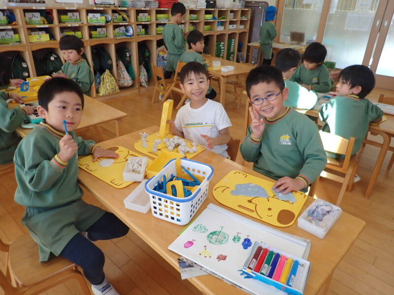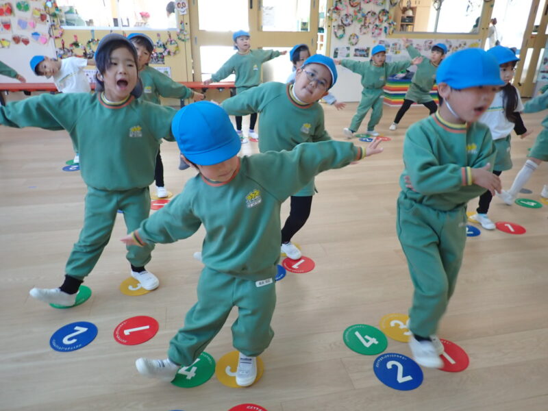 外は、昨夜の強風でイチョウの葉が園庭に大量に落ち、黄色の絨毯の様でした。強い風と共に寒気が入り、外は、かなり冷え込んでいましたが、日差しの入る教室はポカポカ。それぞれ好きな事をして遊んでいました。