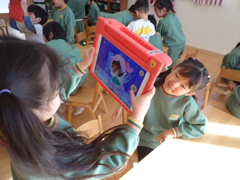 楽しみにしていたタブレットを使ったキッザニアのお話作りが始まりました。「モビー」というアプリを使い、自分の顔写真を好きなキャラクターに入れて、登場人物作り。