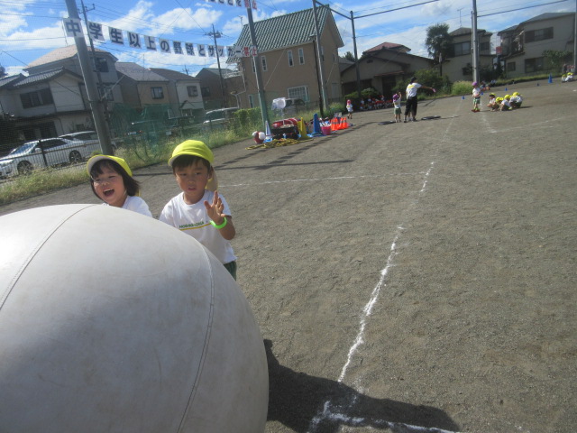 皆で力を合わせて運ぼう~! 大玉が転がりそうになると、周りのお友達がサッとフォローに入って、1度も落ちずに、カゴまで運べたね~!