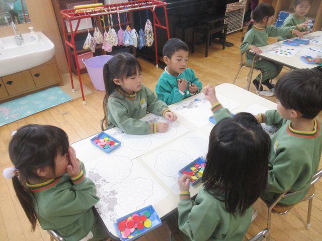 ゲームもグループによって、木になっている「おはじき」を先に全部とった方が【勝ち】というルールや、じゃんけんに勝つと、新しい『木の実』を植え、全部植えられたチームの勝ち!等、自分達で試行錯誤しながらゲームあそびを楽しんでいました!