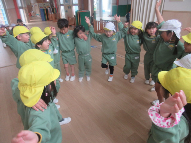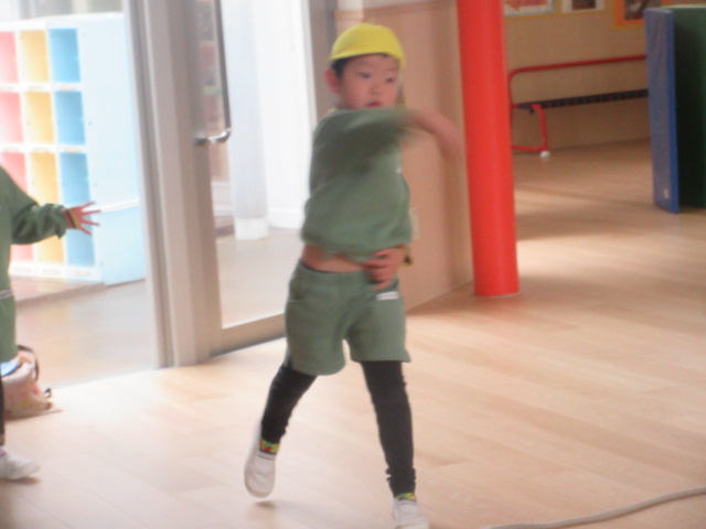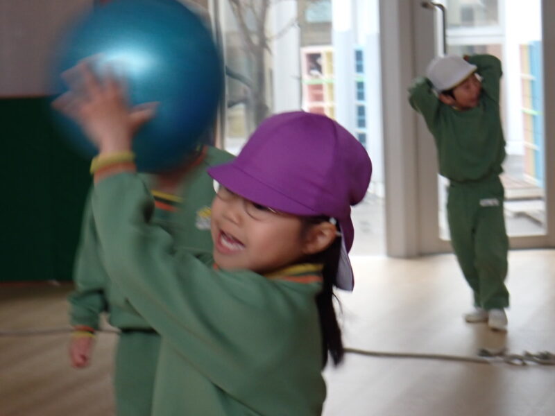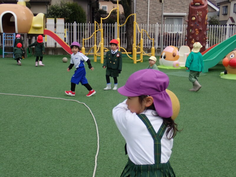 ドッジボールって??から始まった取り組みですが、体育あそびでの取り組みや園庭で外遊びを行う事で、ルールを理解し、どんどんと上達していったな~と感じました。又、なかなか話し合いにはならないですが、おともだちなりに、誰が外野をやる?ジャンプボールは?固まらないで動こう!バウンドボールは捕る!等、「ここをこうするといいよ!」とお互いに声を掛け合う姿が見られ、成長を感じた担任達です。