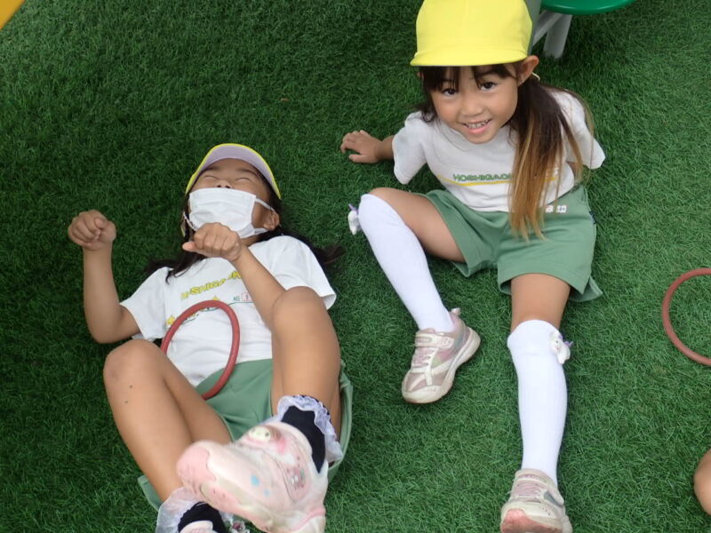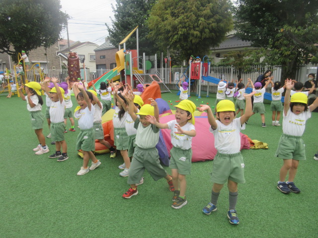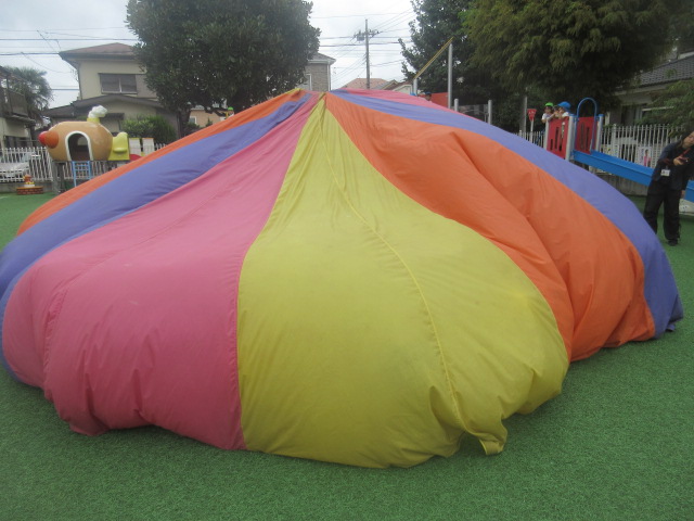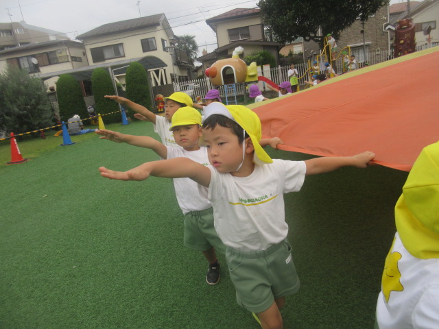 「今日のパラバルーン、どうだったかな?」と聞くと、「全然膨らんでいなかった。」とおともだちからあり、「運動会、このパラバルーンを見せる?」と聞くと、「もっと膨らんでいるパラバルーンがいい!」と答えが返ってきました。そこで、正直に、「砂を嫌がって、引っ張る力が弱かった事」や、「これくらいでいいかな。」と思って、全力を出し切れていないおともだちがいた事を話し、「このまま皆の気持ちがバラバラだと、うまく膨らまない」事を伝えました。