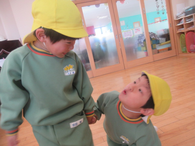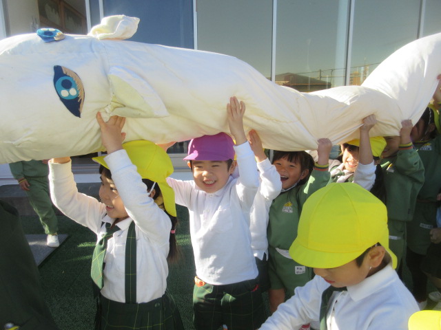 午後、キューブで遊んでいると、「おともだちから、ファルコンごっこしたーい!」と要望があり、担任と「ファルコーン!!」とネバーエンディングストーリーごっこをしていると…。友美先生が教材室から「龍」を持ってきて下さり大興奮!!