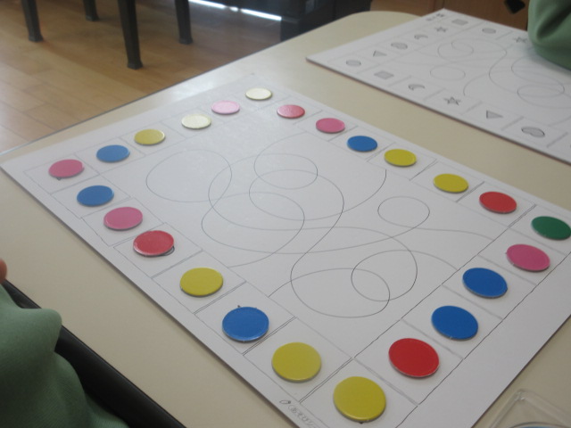 「色」のルーレットを使って、出た色のおはじきをとるゲーム、「線と線とが同じマークに繋がってる!」と気付くおともだちもいました(*^^*)