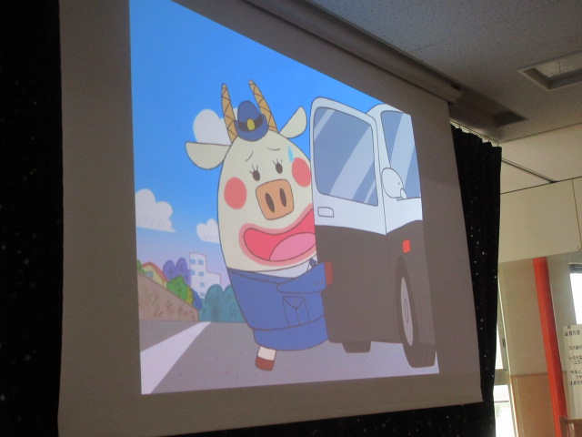 次は、ホールで、交通安全のお話と事故に合わない為のDVDを見たよ~!