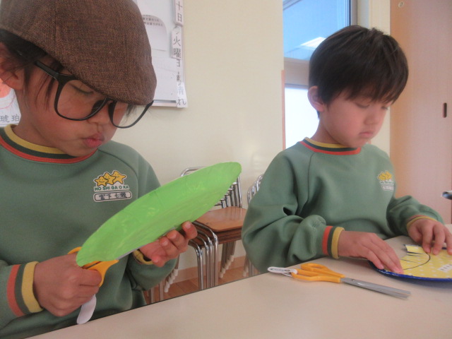朝は、鬼のサンバイザー作りの続きから★ 先週、絵の具を塗った紙皿に、チョキチョキ!と切り、のりしろを作りました。