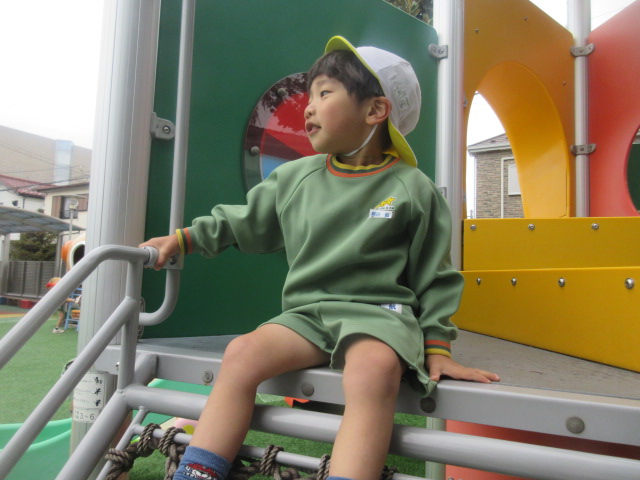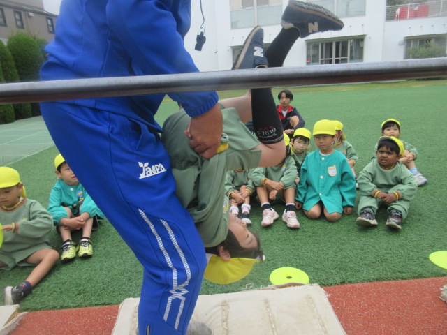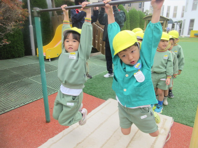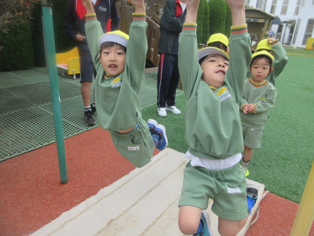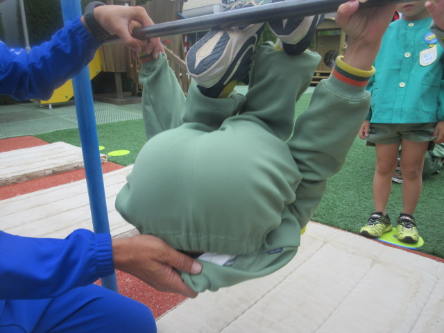 行う前は、「小さい鉄棒の方がやりやすいよ~」とお話をしていましたが、やってみると、あれ!?大きい(高い)方がやりやすーい!!と気付いたおともだちでした!ぶら下がる感覚を確認した所で…。。