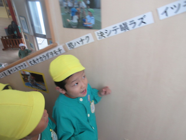 階段には、友美先生が作って下さった「雨ニモマケズ」が掲示されています。読みながら階段を上り、「目で見て」「口ずさんで」いますよ!