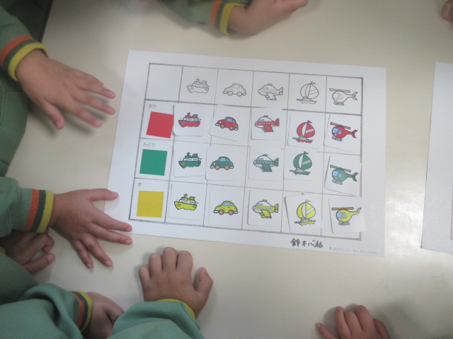 昨日のめざましあそびの続きをしました。昨日よりも、「色」や「乗り物の種類」で分けるおともだちが増えていたよ~。