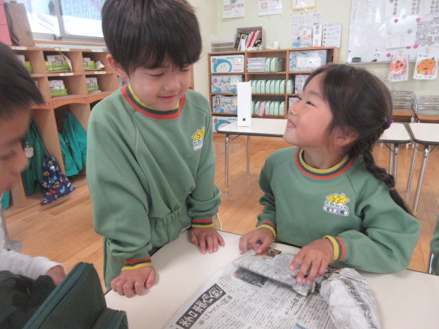 「新聞をくるくる丸めてね…。」、「お芋の形になったら袋に入れてね…」等、友美先生に教えて頂いた事を伝えていました~★