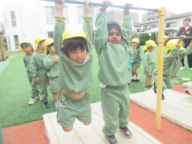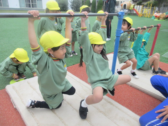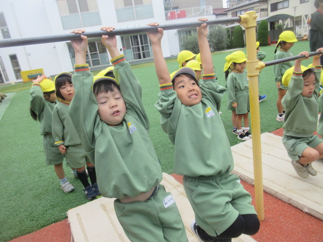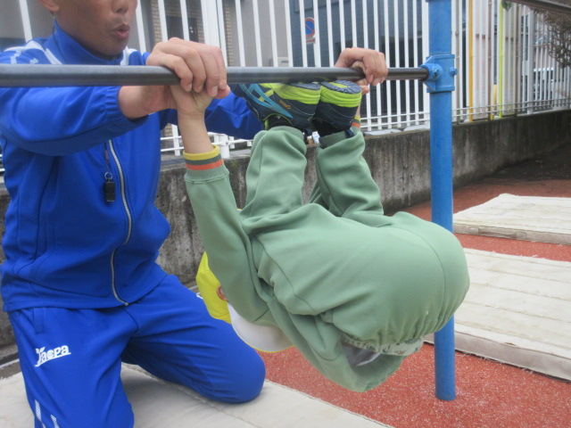 行う前は、「小さい鉄棒の方がやりやすいよ~」とお話をしていましたが、やってみると、あれ!?大きい(高い)方がやりやすーい!!と気付いたおともだちでした!ぶら下がる感覚を確認した所で…。。