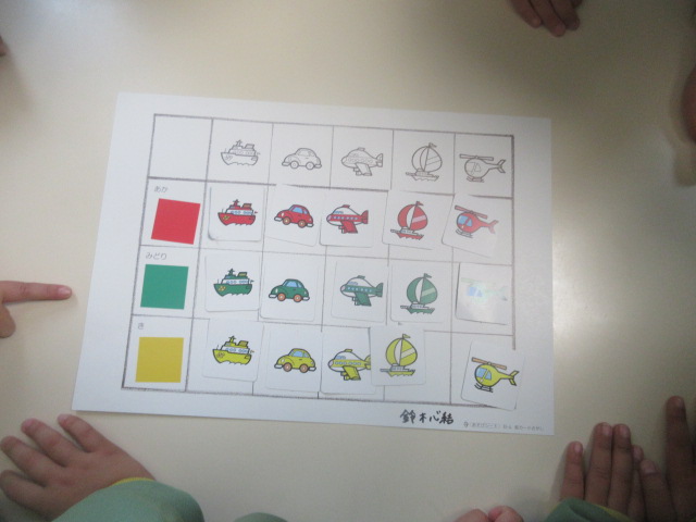 昨日のめざましあそびの続きをしました。昨日よりも、「色」や「乗り物の種類」で分けるおともだちが増えていたよ~。