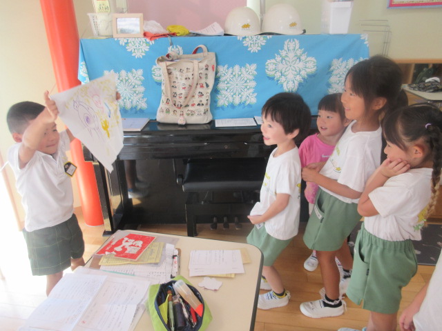 昨日、お誕生日のお祝いをしてもらったおともだちが、「お祝いしてもらって、嬉しかったから、書いてきた~!」と披露!皆も「すごーい!」と笑顔いっぱい!