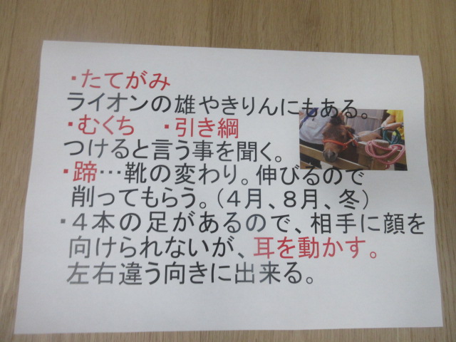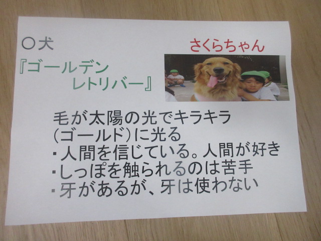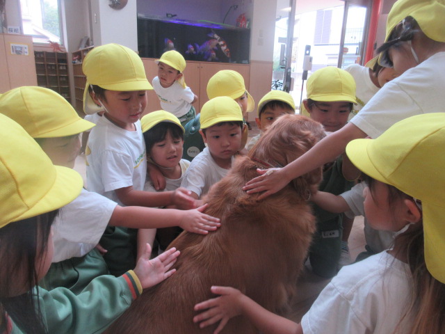 ミニ牧場の話をした後に、ホールでさくらちゃんに会ったよ~!「尻尾は、触らない!」、「頭じゃなくて、あご(首)を触るんだね~!」と声を掛けながら触れ合いを楽しんでいました!