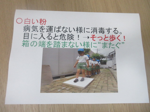 厩舎(きゅうしゃ)に入る時には、白い粉を踏んで(外のばい菌を持ち込まない為)行きます!