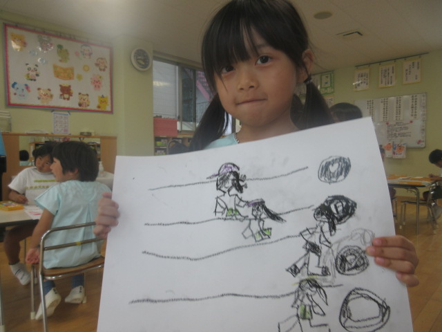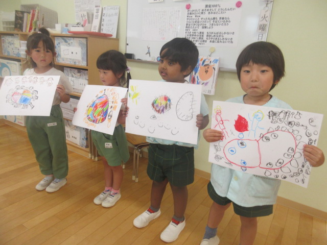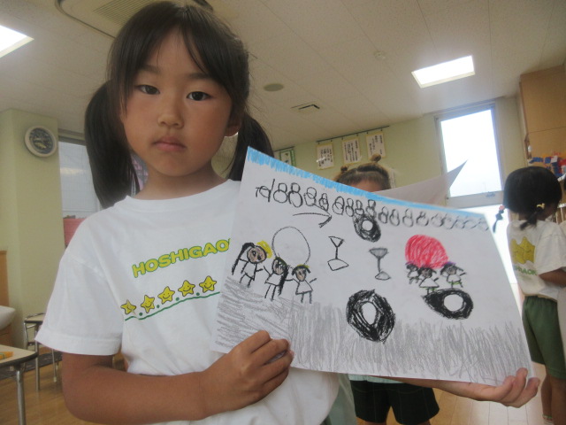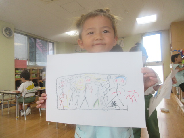 4~5人ずつにわかれて、どんな絵を描いたかな!?発表会をしたよ!