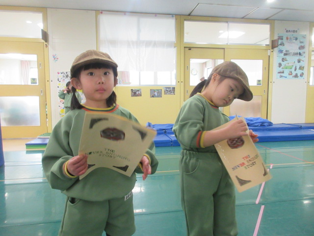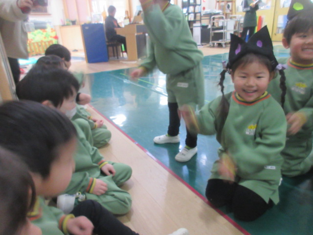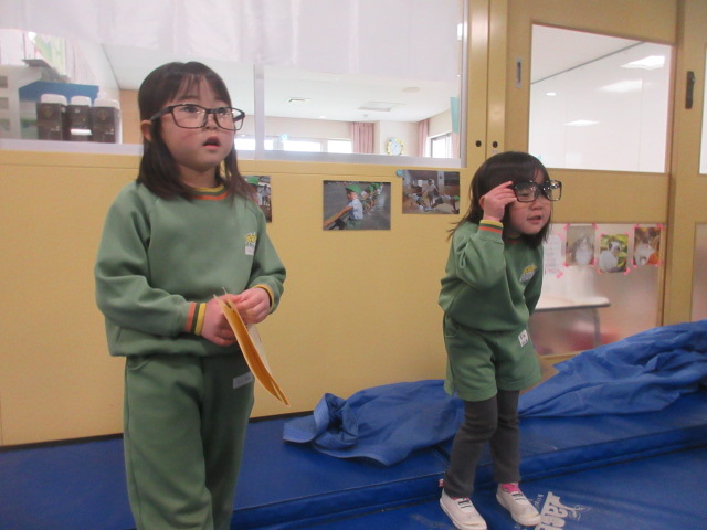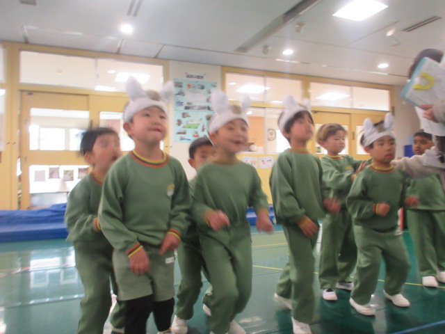 今日も、3分の1のおともだちが休んでしまい、少ない人数での取り組みとなった菊組さん。又、教室では、新しいペアになった事を伝え、ホールでの取り組みを行いました。急遽、変更した所もありましたが、自分達で、動き、考え、表現する姿に、成長を感じた担任です。