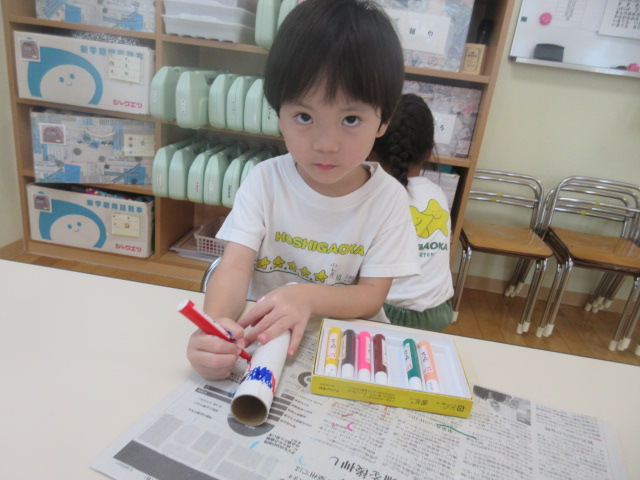 来たおともだちから、順番に、「応援スティック」の飾りつけ✨(夏休み号で集めたラップの芯は、「バトン」ではなく「応援スティック」に変身しました!)