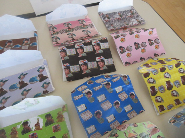 朝は、昨日、タブレットで作った封筒をチョキチョキ&折り折り&糊でぬりぬり!