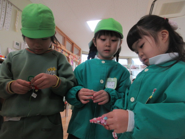 「ここを丸くしてね…。」、「紐の中に入れてね…。」と丁寧に教えてくれました!