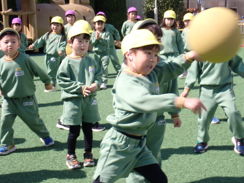 園庭ではドッジボール!!「ドッジボール、ちょっとなぁ~…」というおともだちもいましたが、「一緒にやろうよ!」、「やらないと負けちゃうよ!」と、仲間に声を掛け、全員参加!途中で、抜けてしまうおともだちもおらず、最後まで菫組さんと熱い試合を楽しんだよ!今日は、菊組さんの勝ち~!!(担任が見ていて菊組さんが勝てたの、初めて!やった~~!!)バウンドボールも取りにいこうとする様子や、積極的な姿も見られるようになりました!