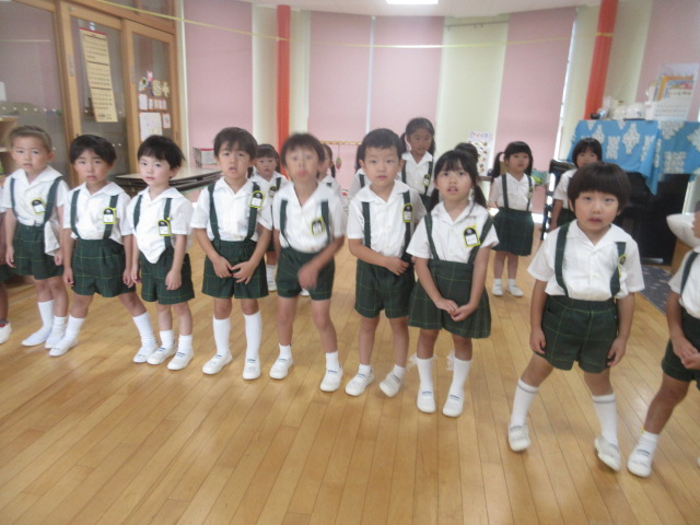 椅子を園庭に設置していた為、今日は、机・椅子なしで朝の会をしました!