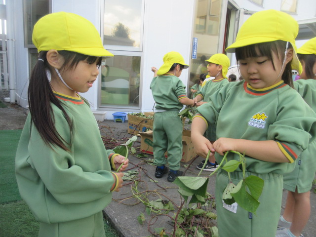 つるの葉っぱの部分をちぎるよ~!なが~いつるは、おともだちと協力して葉っぱをとりました!