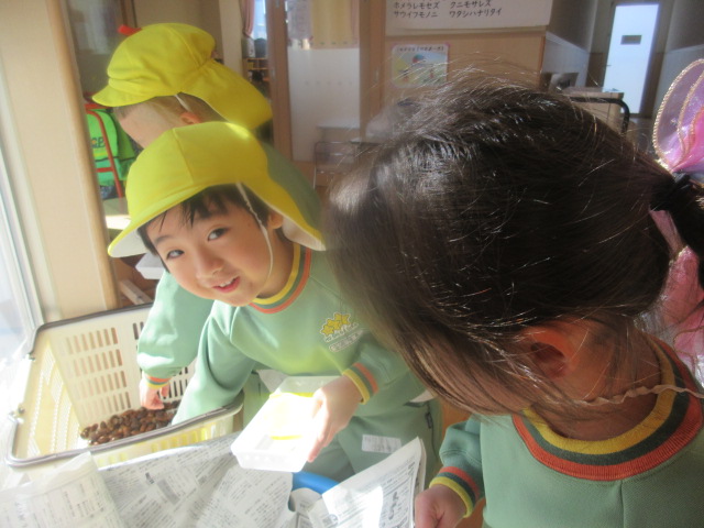こちらはどんぐり屋さん。自分達が横山公園で集めたどんぐりの他、友美先生が、先日、どんぐりを集めて下さり、量が増えました💛ありがとうございます。煮沸は担任達と友美先生で行いました(#^^#) これで虫が出てこないね!