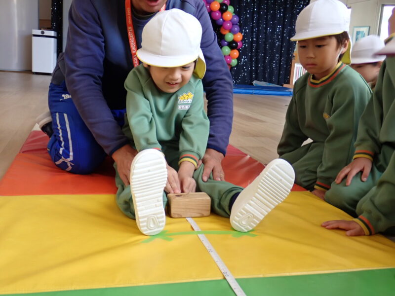 今日の体育あそびは、年中組Aチームと年中組Bチームに分かれて、取り組みました。今回は【運動能力テスト】。過去の自分の記録より伸びたかな?現状維持かな?と、【両足連続跳び】、【長座体前屈】、【立ち幅跳び】、【25M走】4つの観点で記録を計ります。今日は、25M走はお休みでした。