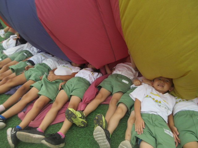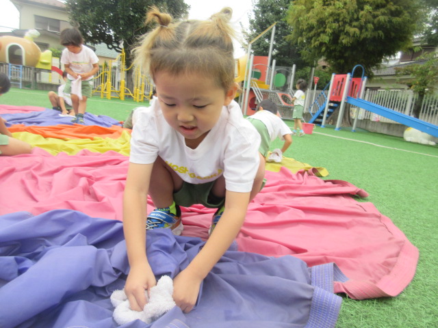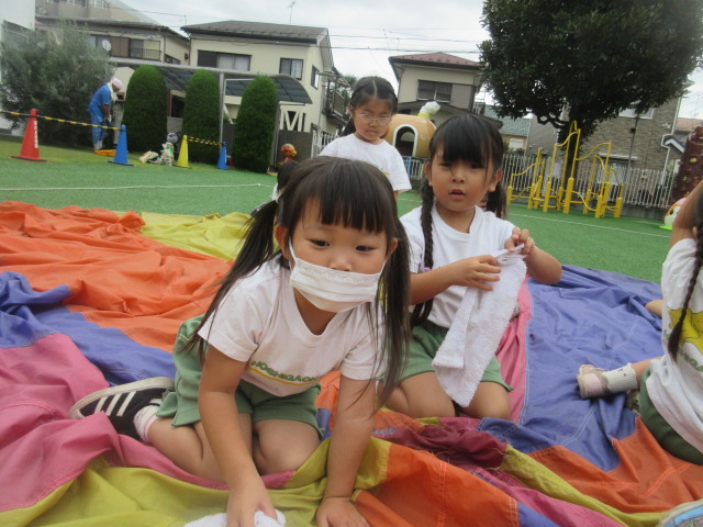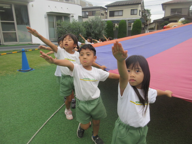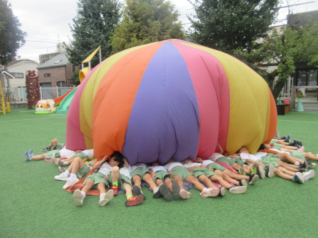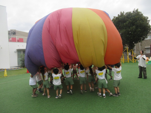 昨日、お休みが多かった菊組さん。火曜日、水曜日とパラバルーンを取り組んだ日にお休みをしてしまったおともだちもいた為、運動会前、最後のパラバルーンを行いました!