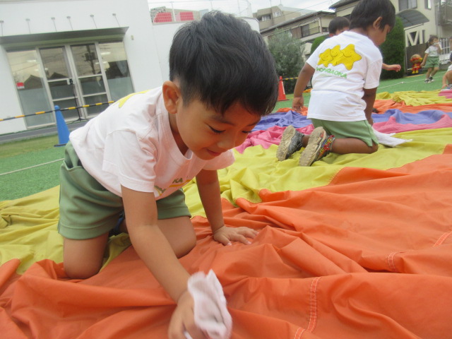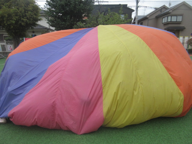 園庭でパラバルーンが膨らんだ!→学校だとなかなか膨らまない…。→学校でも膨らむ様になった!