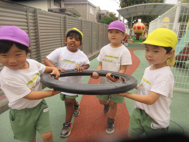 使った後は、タイヤのお片付け★みんなで協力してエッホ、エッホと運びます。