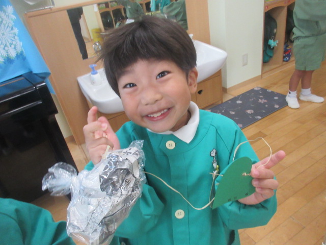 中学生のお兄さん先生の力も借りて、お芋が完成したよ~!明日、砂場に植えて掘り掘り~★ごっこをする予定です!