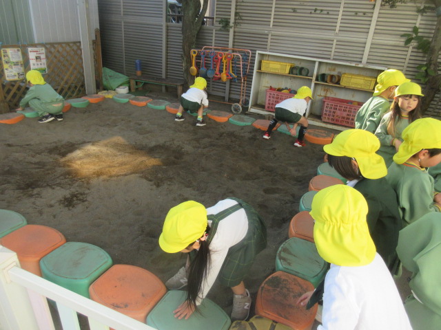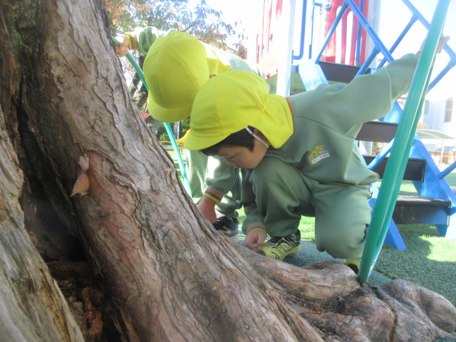 外遊びでは、虫探しや猫ちゃんごっこが大人気だった菊組さん。