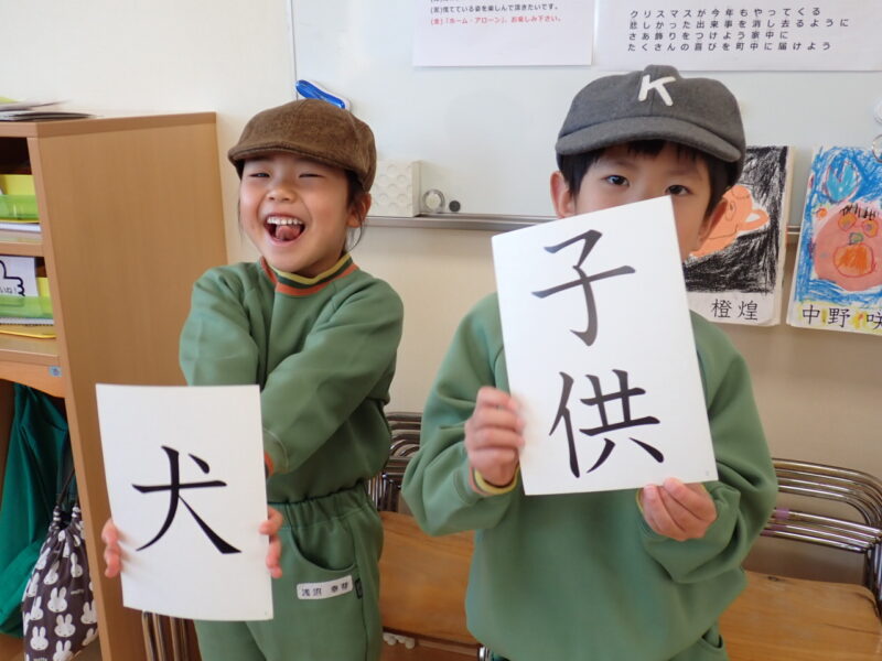 久しぶりの漢字あそび!新しい漢字絵本「花咲か爺さん」のフラッシュカードを楽しみした。 ホーム・アローンの役になりきりながら取り組んだよ!