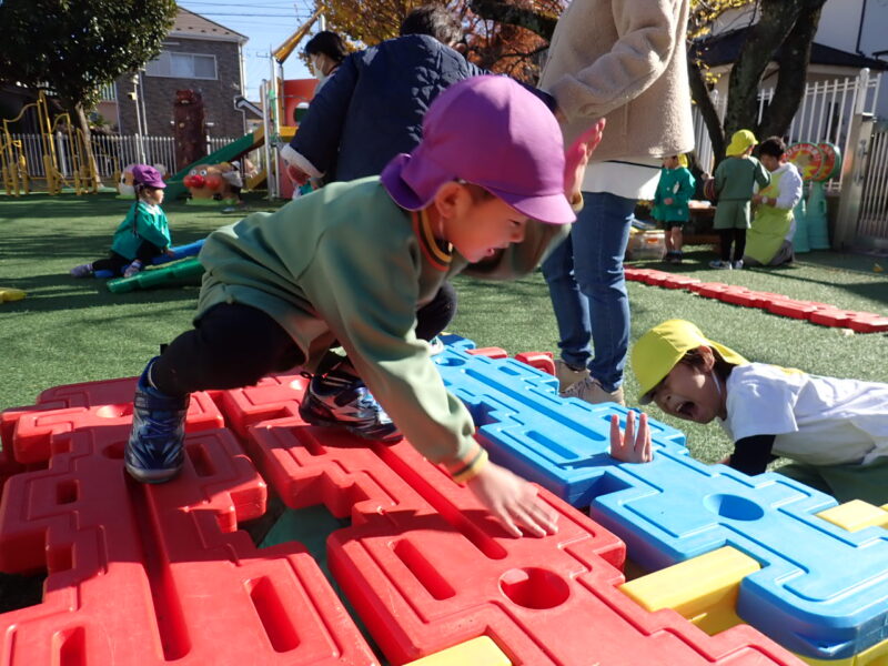 ブロックの下から、手がにょきにょき✋ モグラ叩きを楽しんでいました。