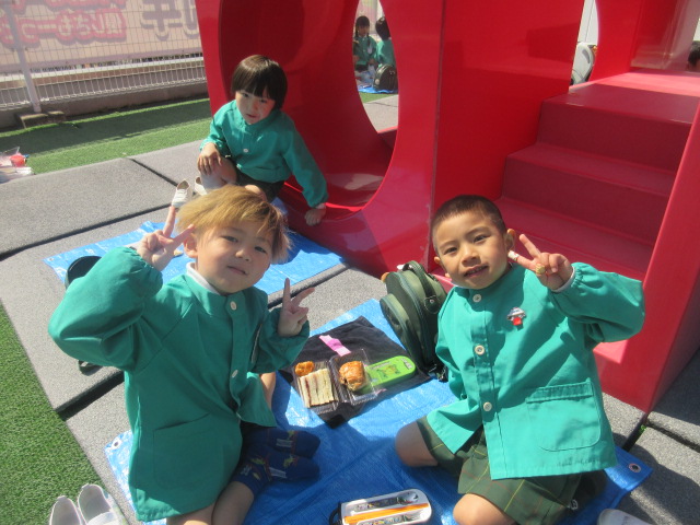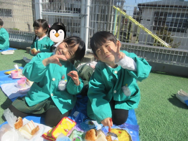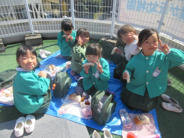本日は年中さんで食べる最後のパン給食でした🍞 菊組さんと一緒に屋上のキューブにシートを敷いて、青空の下でパンを食べました。