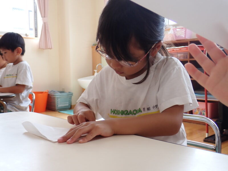 「折ってあげるよ」ではなくどう伝えたらいいのだろう、と悩みながら、折っている様子を隣で見せながら行ったり、片方折って、反対側は「折ってみて」と伝えたり、少し折り線を付けて「これの通りにやってごらん」など「教える」にもたくさんの工夫が見られました。