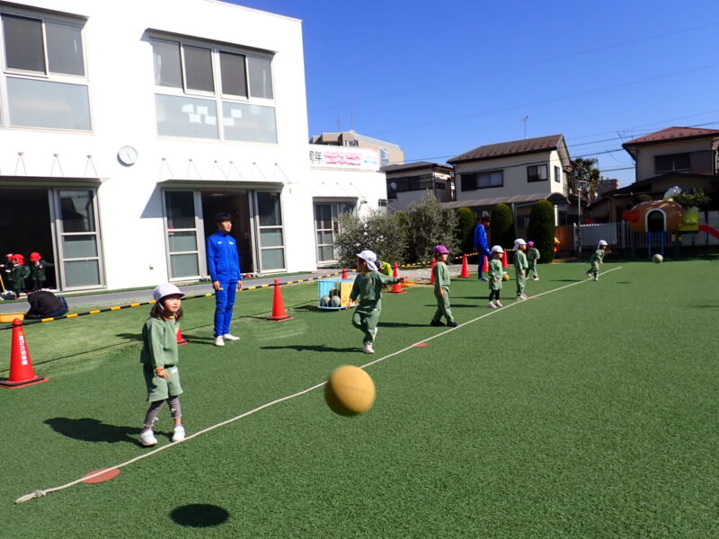 まずは、ペアを作ってキャッチボール!相手をよーくねらって大きく投げよう!