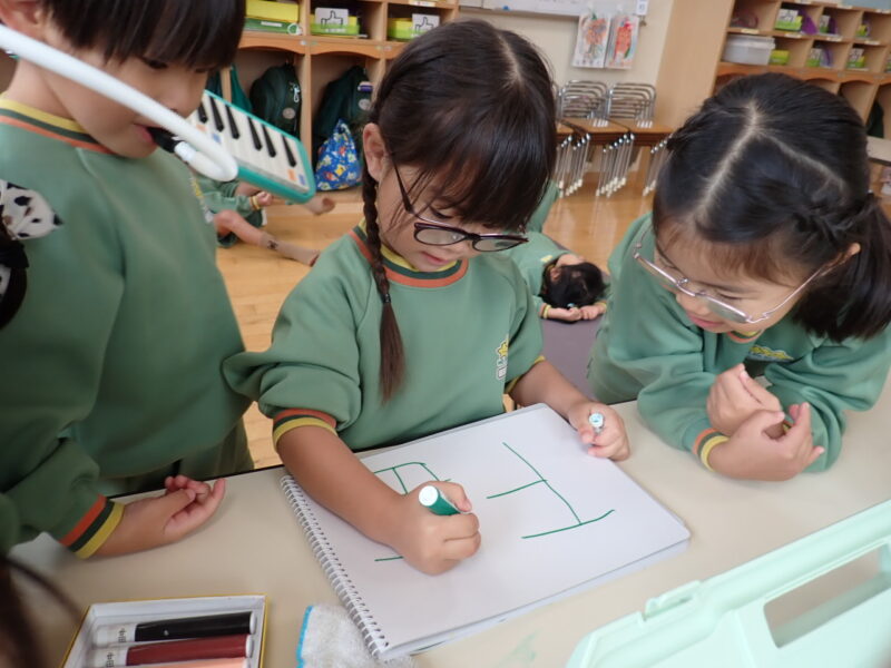 「自分の名前漢字で書けるんだよ」と披露しているお友だち。