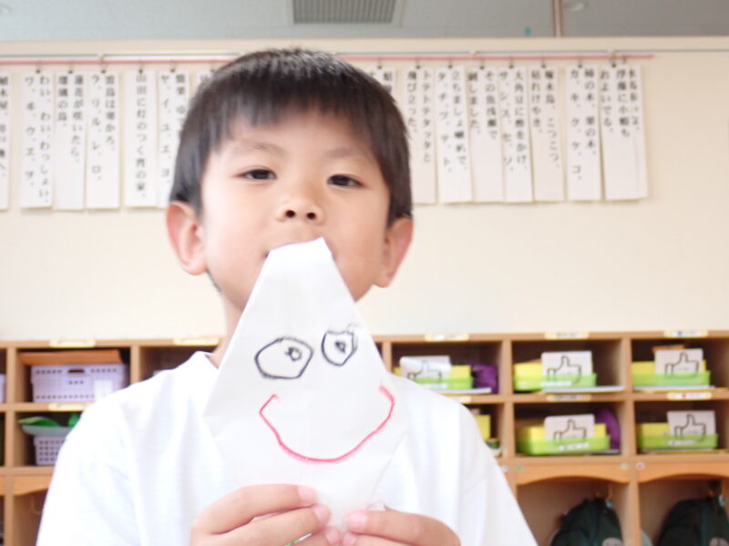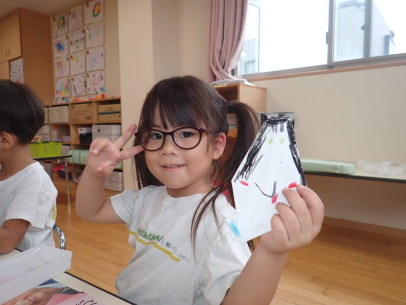 朝は、昨日作ったおばけ👻の折り紙に顔を描きました。