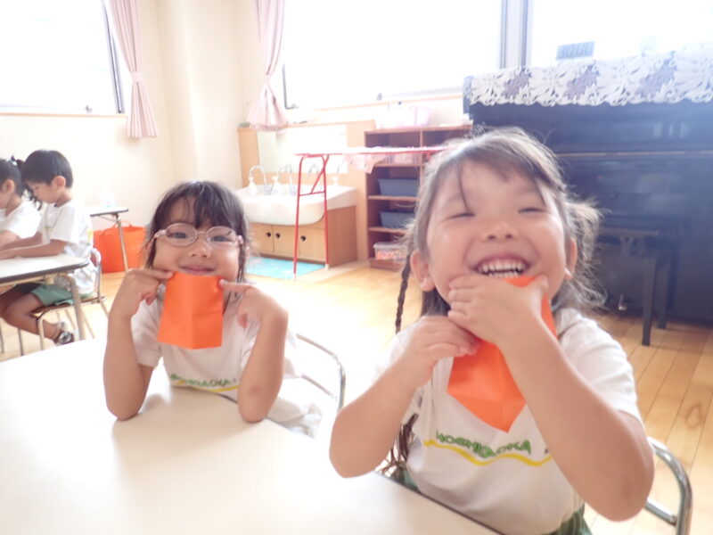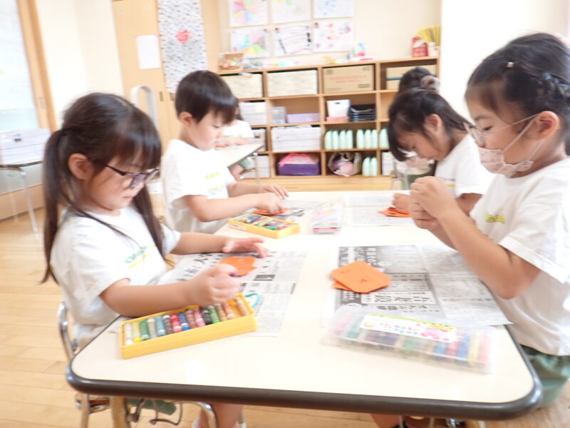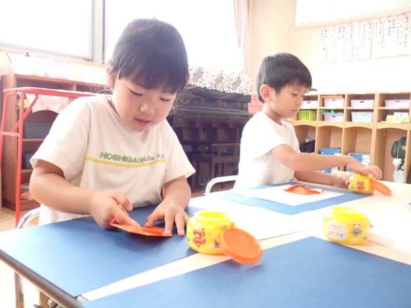 折る説明の際に「みんなの得意な」というと「三角折りだー」とすぐに気が付き角と角を合わせて真剣に折っています。