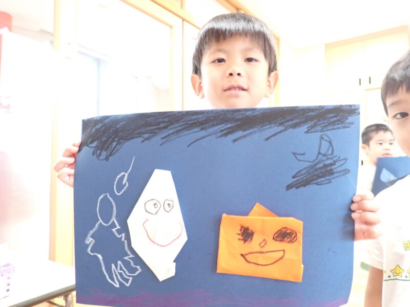 真っ白いおばけはどんな顔にしようかなー「怖い顔にしようかな」、「可愛い顔にしようかな」、「カッコいい顔もいいな」と、悩みながら描いていました。