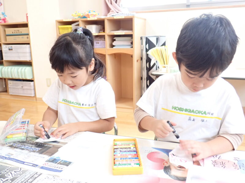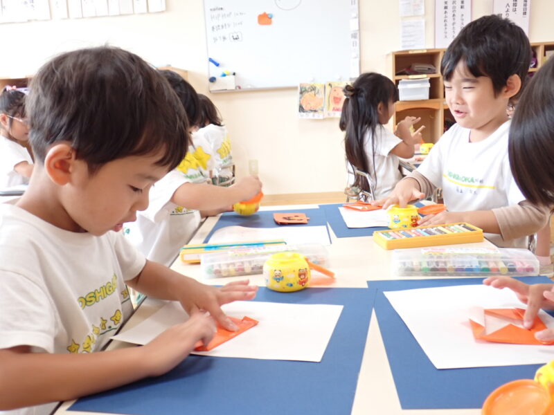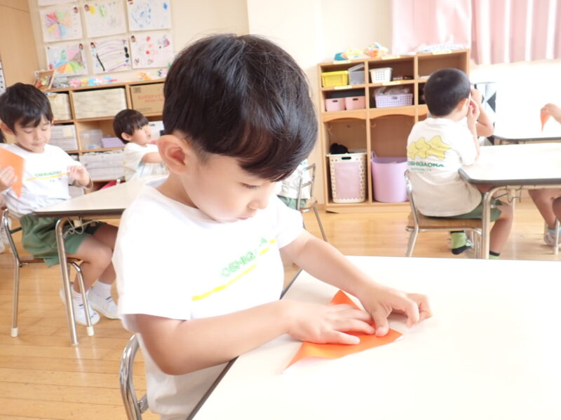 折る説明の際に「みんなの得意な」というと「三角折りだー」とすぐに気が付き角と角を合わせて真剣に折っています。