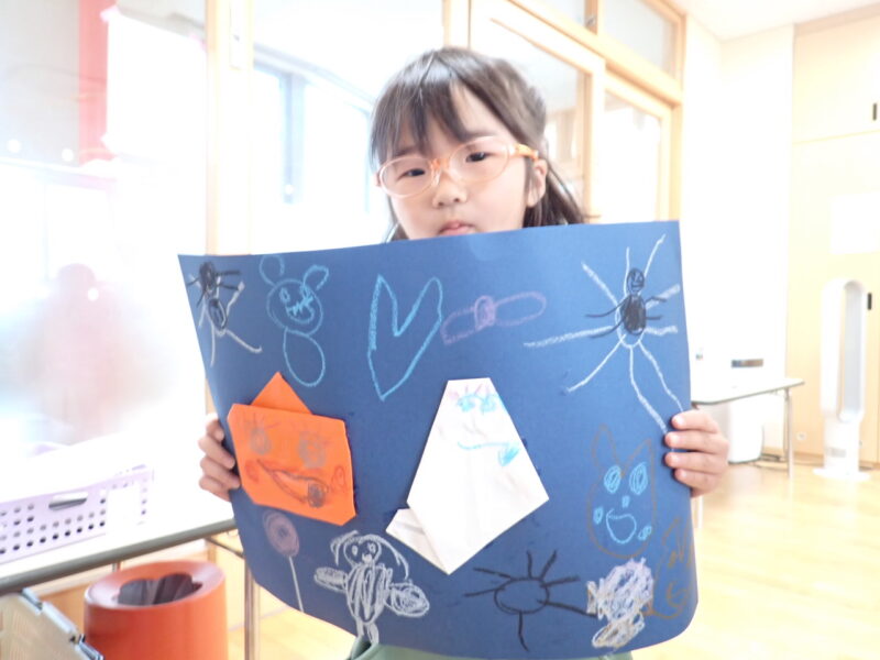 「SCARY」(怖い)と英語あそびで行った内容も楽しみながら怖い絵をたくさん描いた菫さんです。