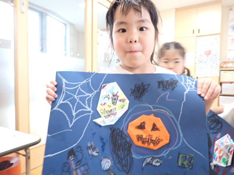 「出来た」とみんなで完成したカボチャをお披露目!