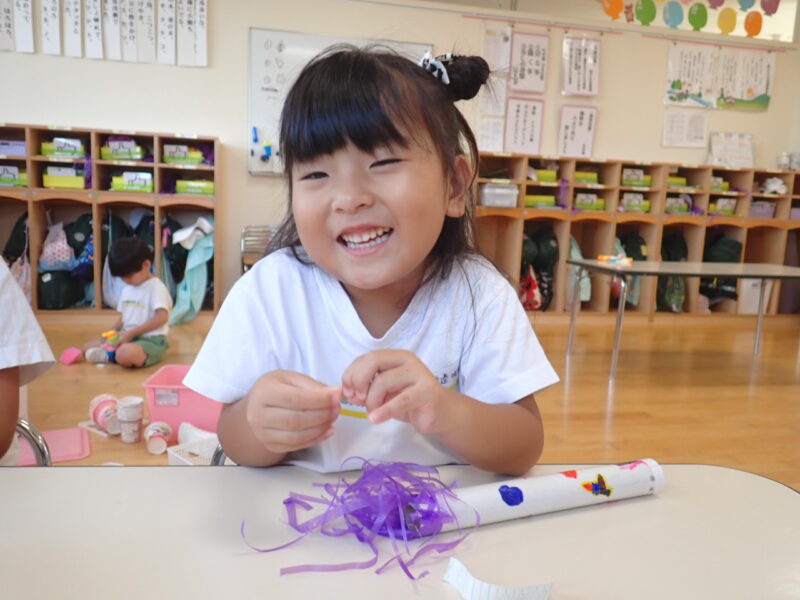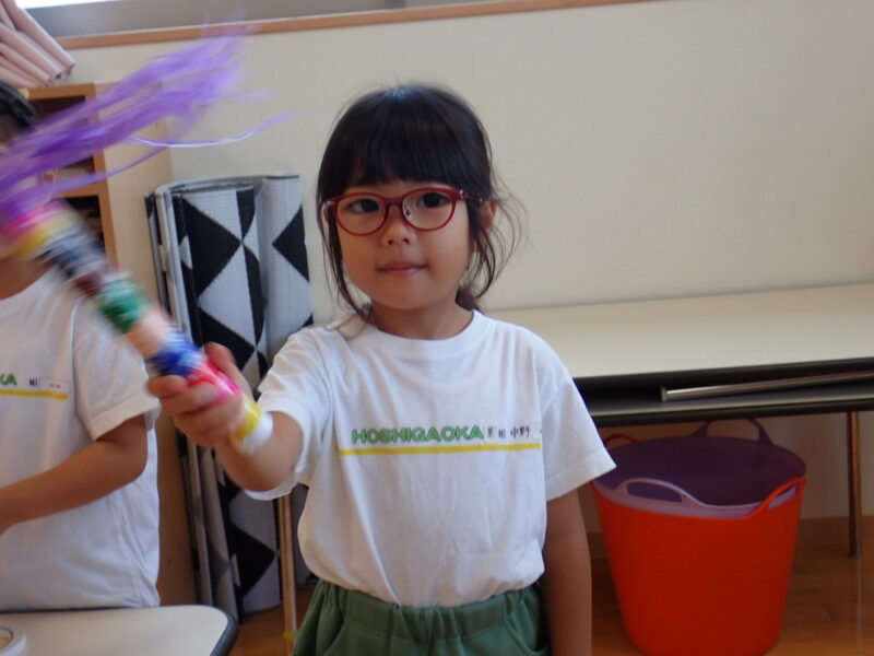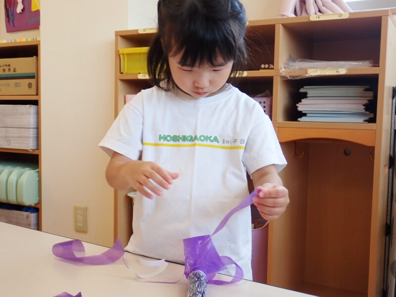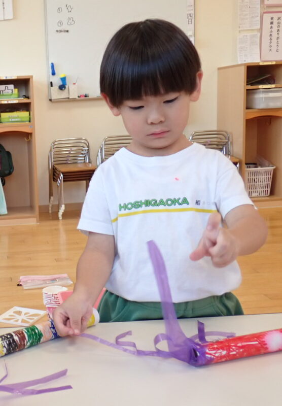 集中して指先を上手に使っています。「あ!まだまだ細く出来そうな所みーつけた」