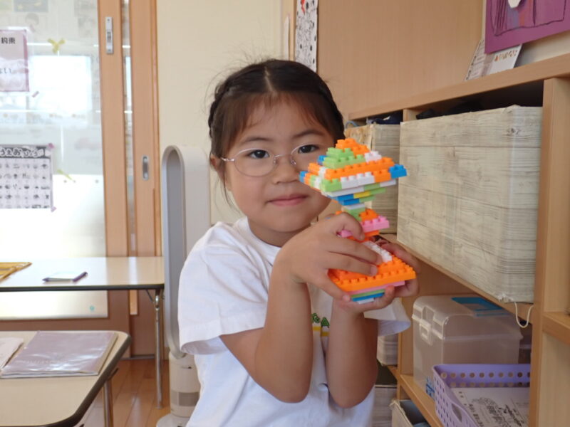 朝、お友だちがブロックで作ったが始めはコマのような形からどんどん土台が増えていき、